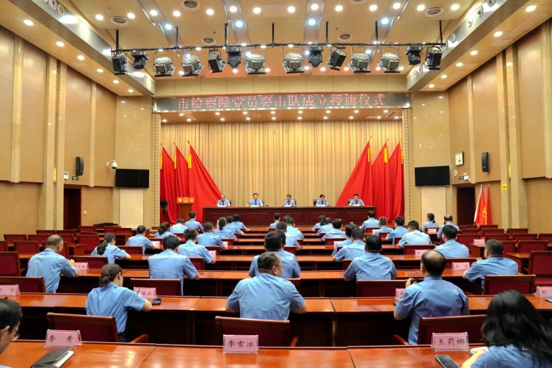 市院举行党员突击队成立授旗仪式。仪式上,市院党组书记、检察长宋晓磊为组建的“蓝锋”办案团队和“蓝锐”办案团队两支党员突击队授旗。院党组号召市院各党支部、各部门要以党员突击队为标杆闻令而动,树牢深度融合的理念,找准深度融合的路径,打造党建赋能业务的“强引擎”,构建“抓在日常、严在经常”的长效格局,在全院形成“突击队引领、党支部联动”的生动局面,争创一流业绩、推动高质量发展,镌刻属于检察蓝、党旗红的忠诚印记。